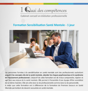 La formation sensibilisation santé mentale d’une journée s’adresse à tous les professionnels souhaitant acquérir les concepts clés de la santé mentale, aborder les risques psychosociaux et le syndrome de l’épuisement professionnel. L’objectif de cette formation est de mieux comprendre, repérer et agir face aux enjeux de la santé mentale. Elle permet à l’ensemble d’une équipe d’être sensibilisé de la même manière. Elle est utile dans la vie professionnelle comme dans la vie personnelle.